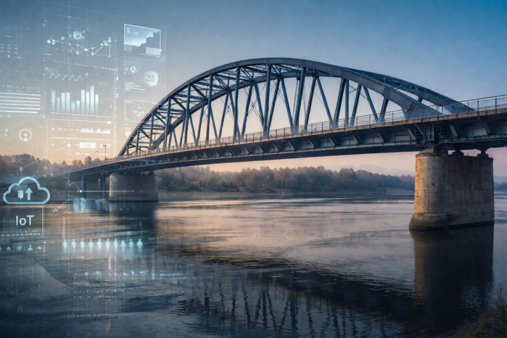 System monitorowania mostu na Sanie w Sanoku, umożliwiający zbieranie i analizę danych z czujników w celu bieżącej kontroli stanu konstrukcji.